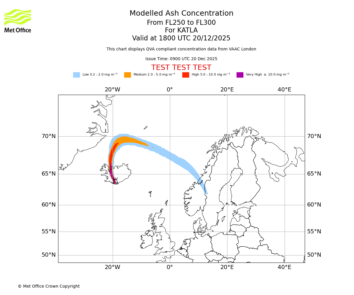 Modelled ash concentration from 200 to 250 for KATLA. Valid at 1800 UTC 20/12/2025