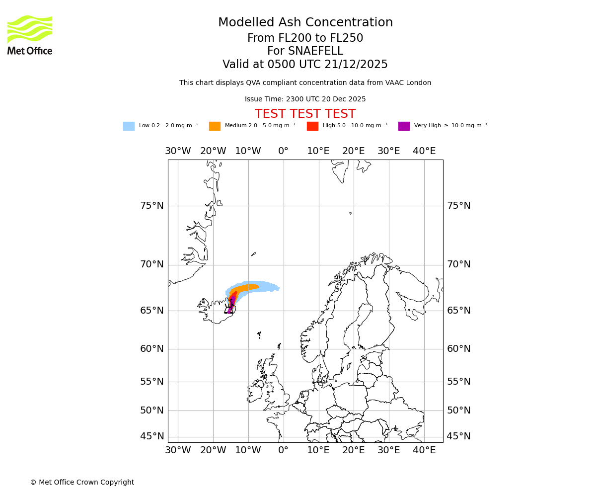 Modelled ash concentration from 200 to 250 for SNAEFELL. Valid at 0200 UTC 21/12/2025