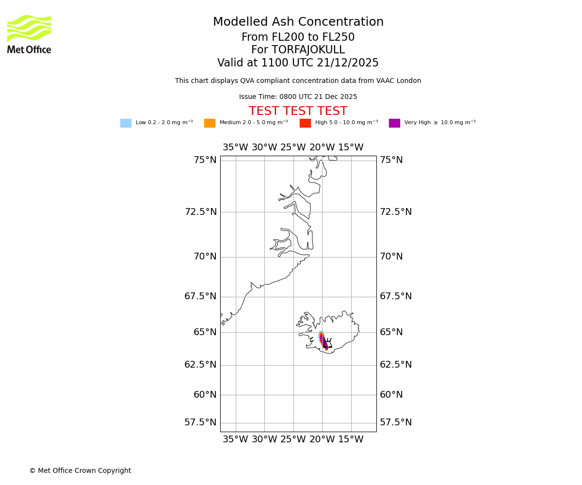 Modelled ash concentration from 200 to 250 for TORFAJOKULL. Valid at 0800 UTC 21/12/2025