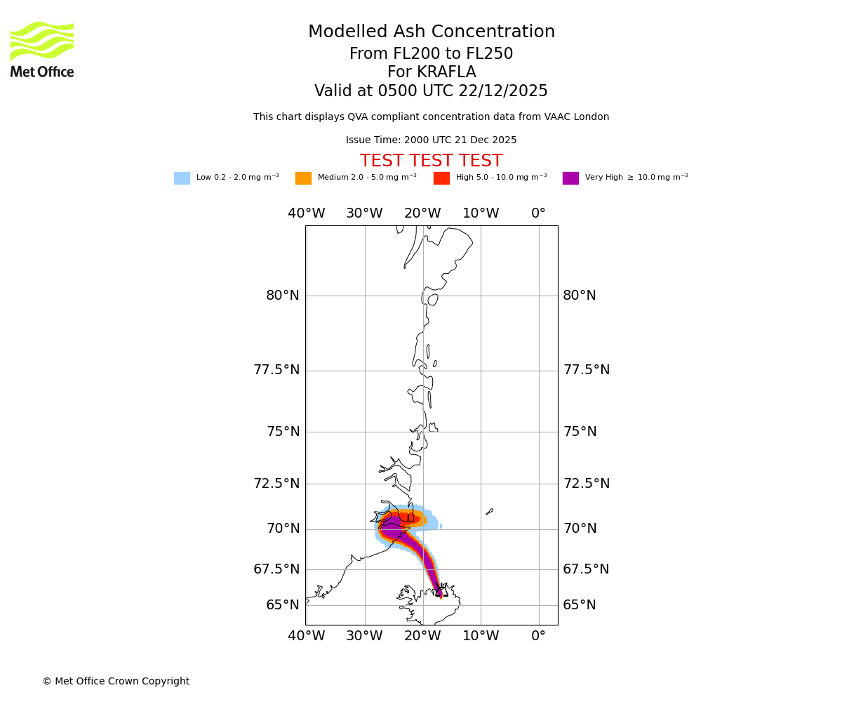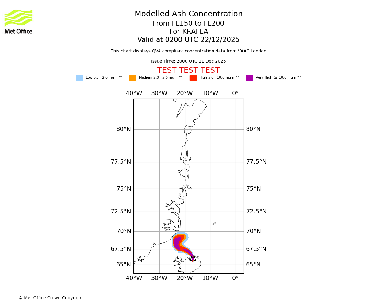 Modelled ash concentration from 200 to 250 for KRAFLA. Valid at 0200 UTC 22/12/2025