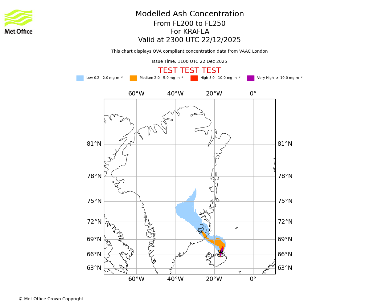 Modelled ash concentration from 200 to 250 for KRAFLA. Valid at 2000 UTC 22/12/2025