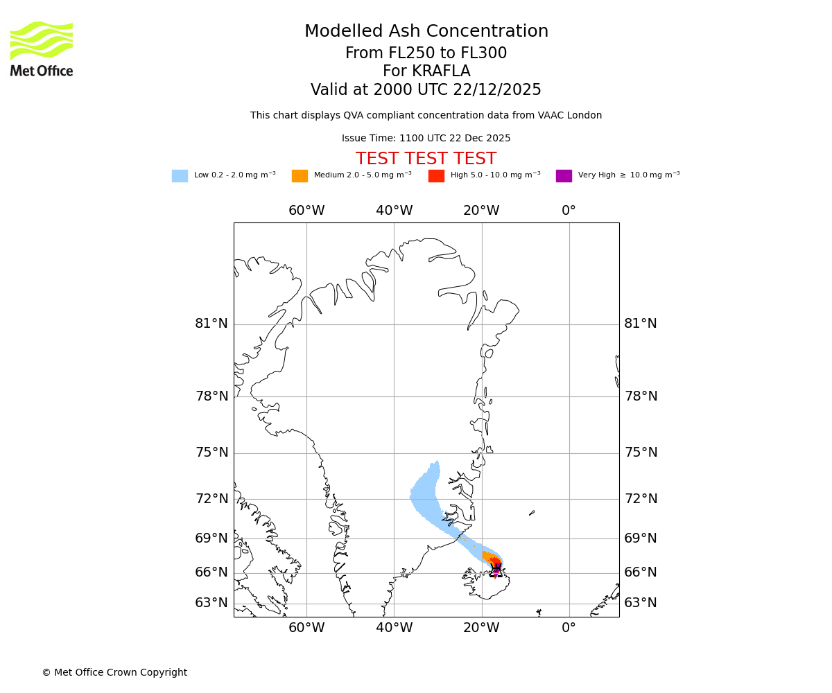 Modelled ash concentration from 000 to 200 for KRAFLA. Valid at 1100 UTC 22/12/2025