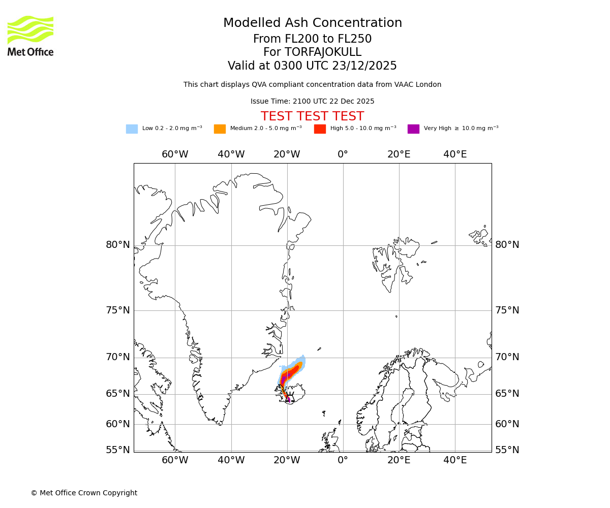 Modelled ash concentration from 200 to 250 for TORFAJOKULL. Valid at 0000 UTC 23/12/2025