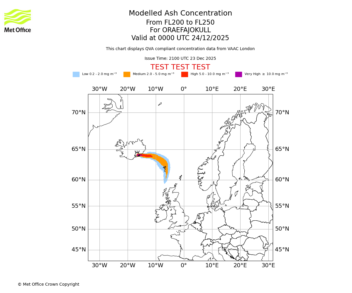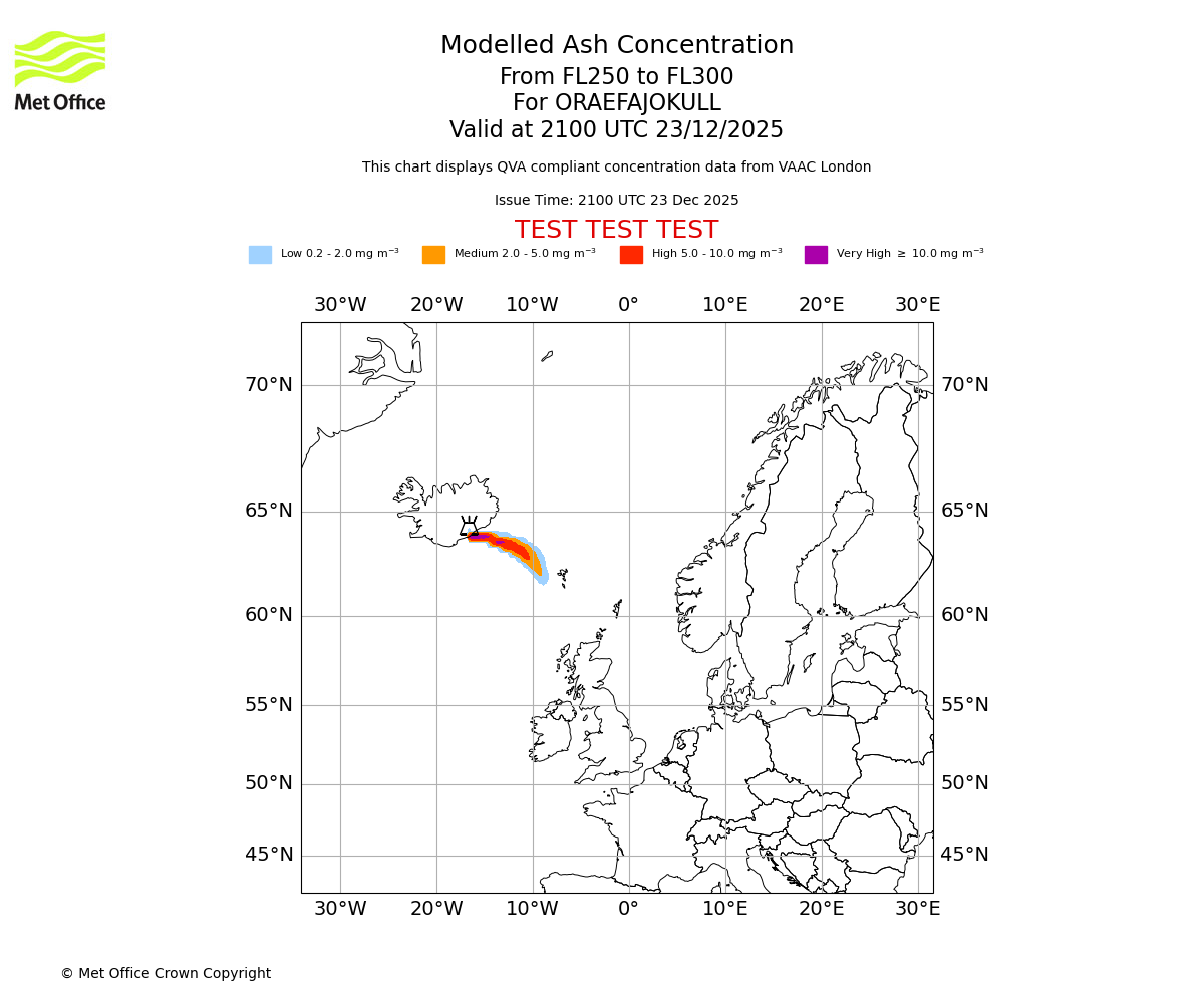Modelled ash concentration from 200 to 250 for ORAEFAJOKULL. Valid at 2100 UTC 23/12/2025