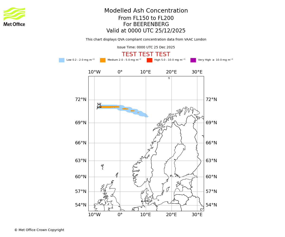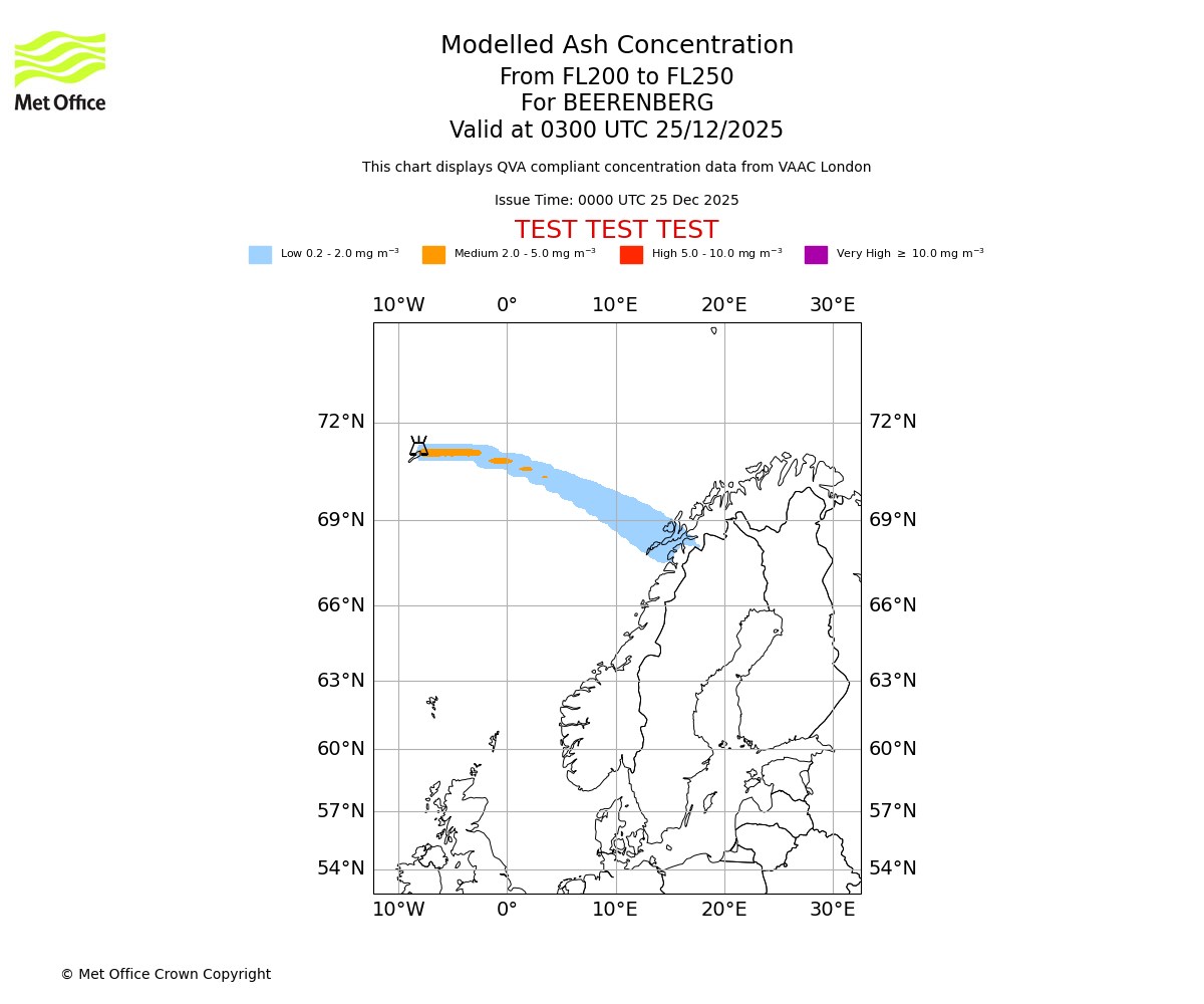 Modelled ash concentration from 200 to 250 for BEERENBERG. Valid at 0000 UTC 25/12/2025