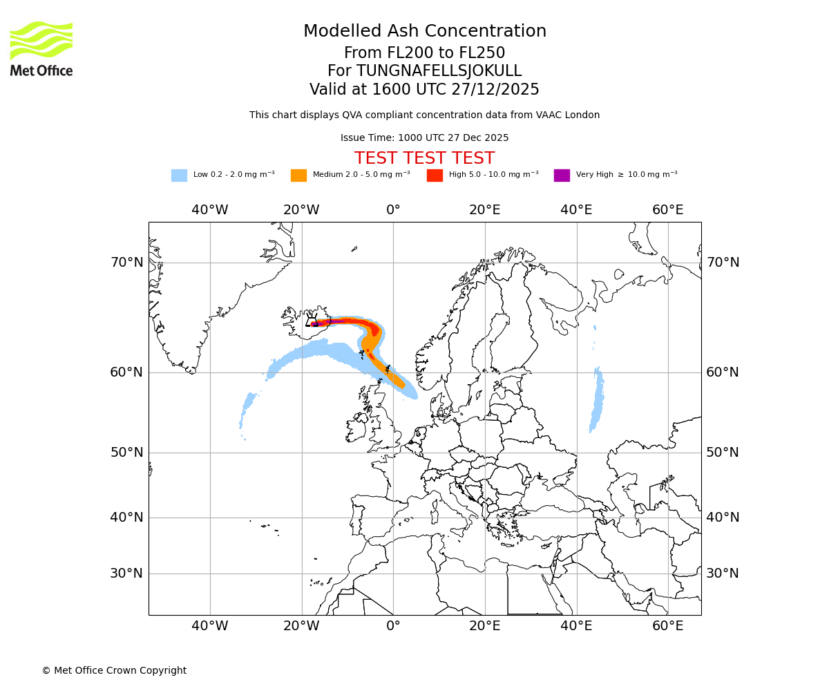 Modelled ash concentration from 200 to 250 for TUNGNAFELLSJOKULL. Valid at 1300 UTC 27/12/2025