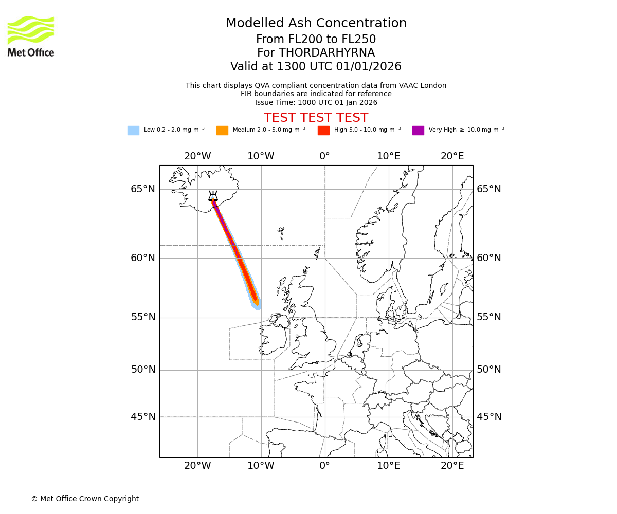 Modelled ash concentration from 200 to 250 for THORDARHYRNA. Valid at 1000 UTC 01/01/2026
