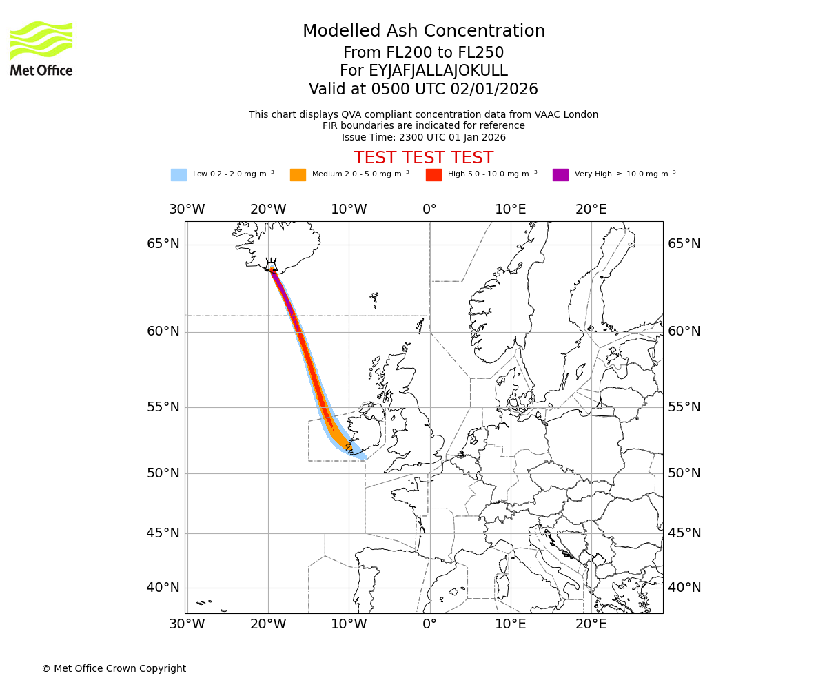 Modelled ash concentration from 200 to 250 for EYJAFJALLAJOKULL. Valid at 0200 UTC 02/01/2026