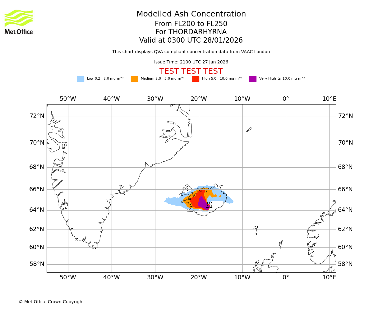 Modelled ash concentration from 200 to 250 for THORDARHYRNA. Valid at 0000 UTC 28/01/2026