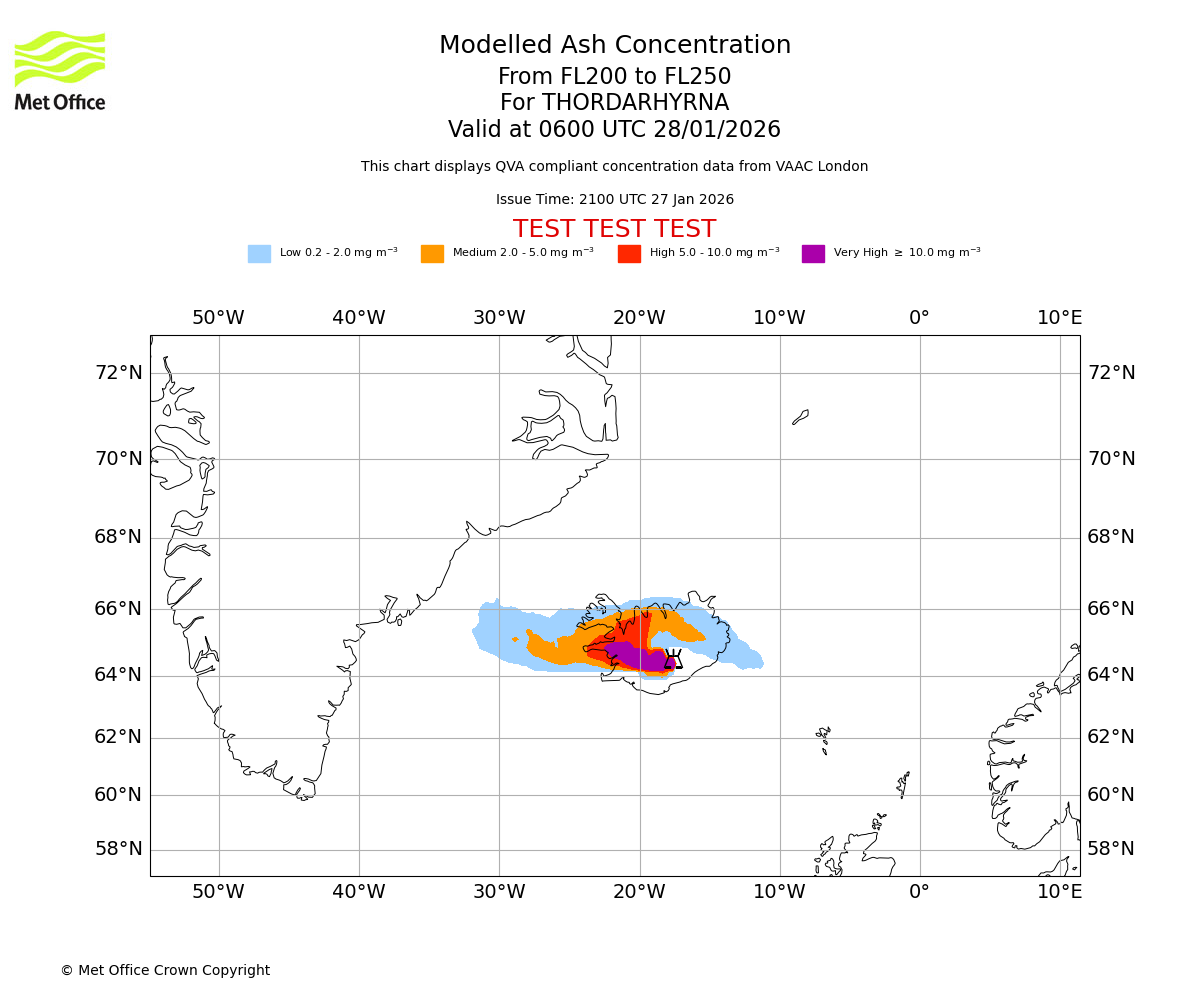 Modelled ash concentration from 200 to 250 for THORDARHYRNA. Valid at 0300 UTC 28/01/2026