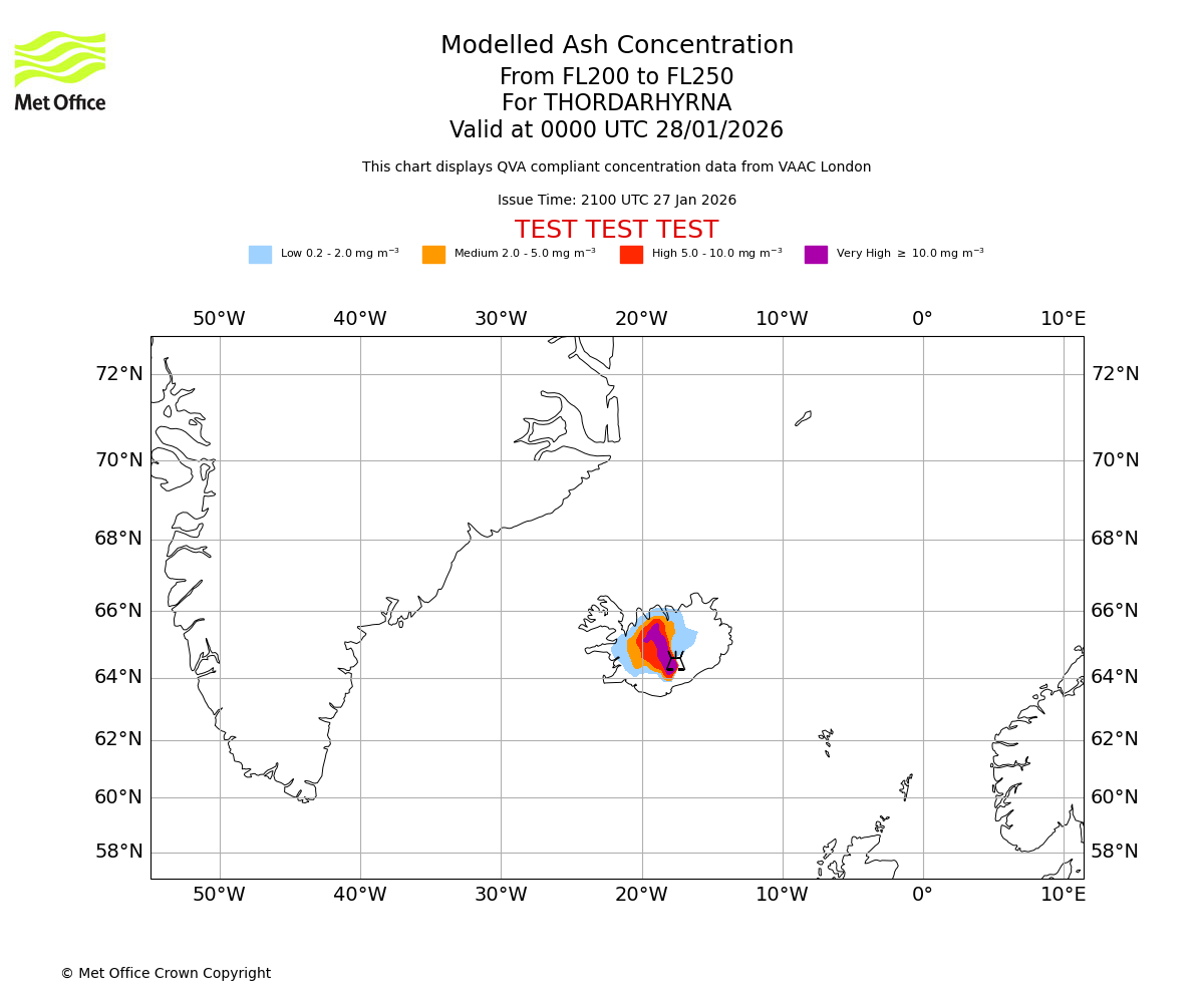 Modelled ash concentration from 200 to 250 for THORDARHYRNA. Valid at 2100 UTC 27/01/2026