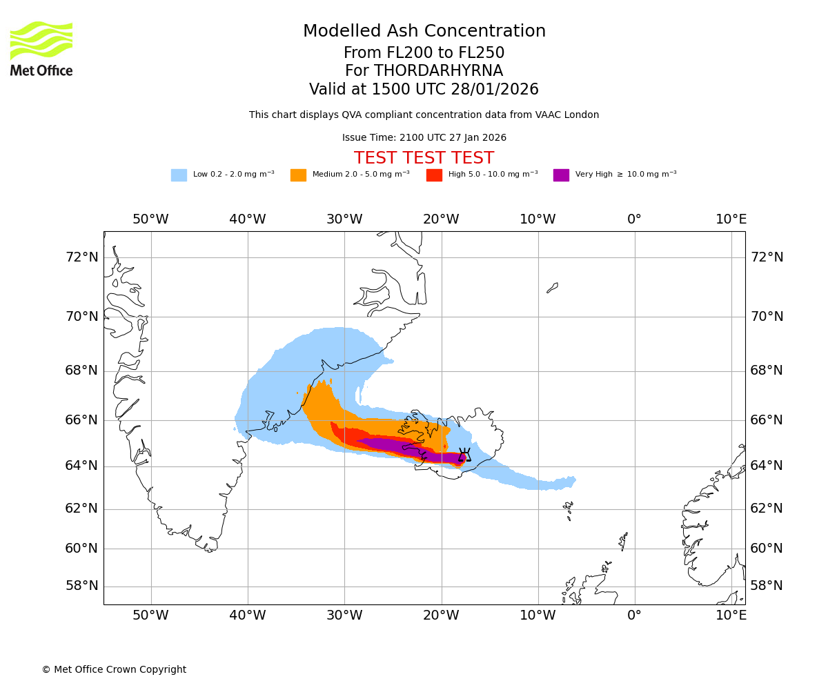 Modelled ash concentration from 200 to 250 for THORDARHYRNA. Valid at 1200 UTC 28/01/2026