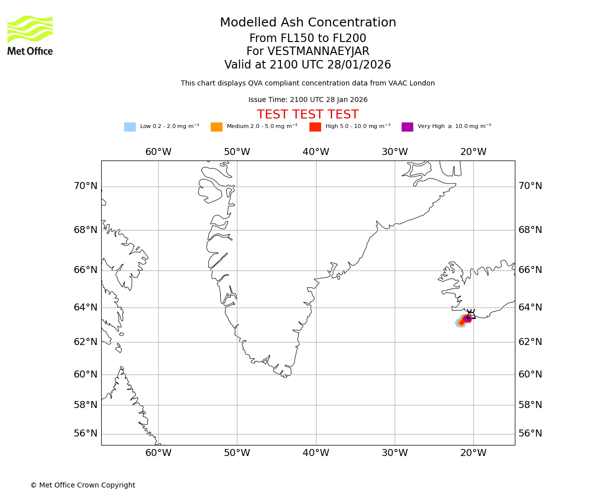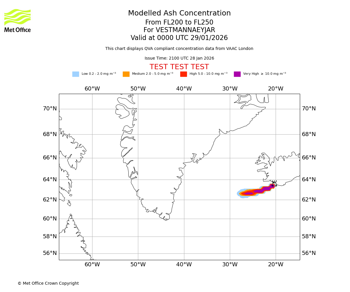 Modelled ash concentration from 200 to 250 for VESTMANNAEYJAR. Valid at 2100 UTC 28/01/2026