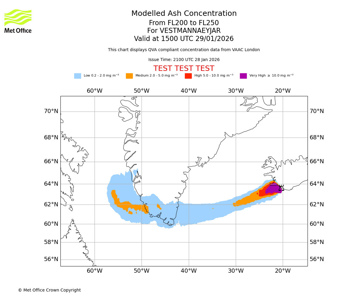 Modelled ash concentration from 200 to 250 for VESTMANNAEYJAR. Valid at 1200 UTC 29/01/2026