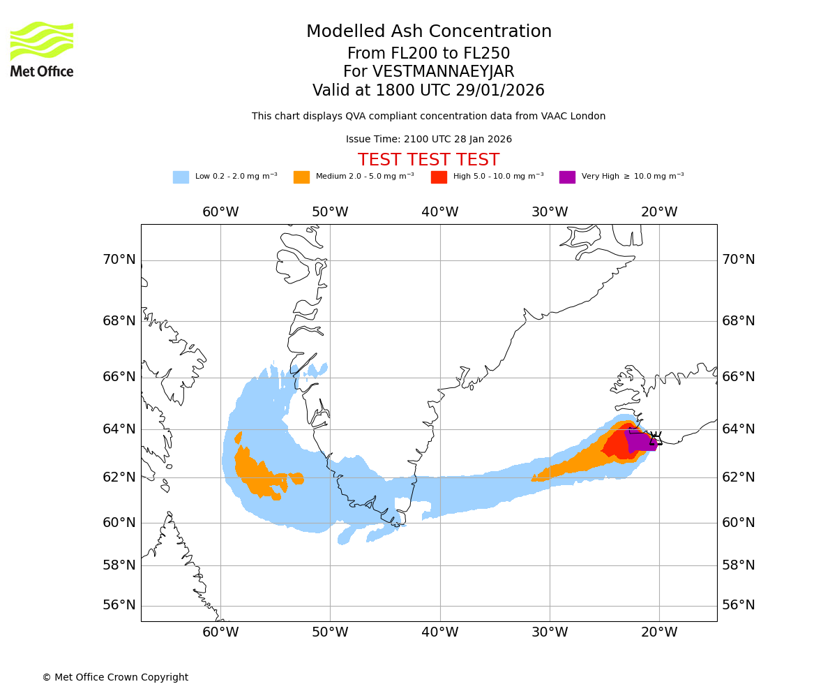 Modelled ash concentration from 200 to 250 for VESTMANNAEYJAR. Valid at 1500 UTC 29/01/2026