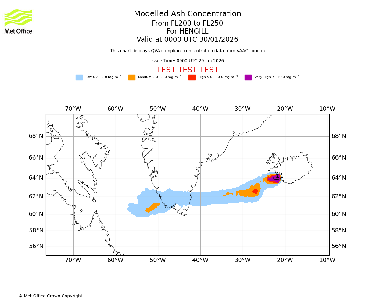 Modelled ash concentration from 200 to 250 for HENGILL. Valid at 2100 UTC 29/01/2026