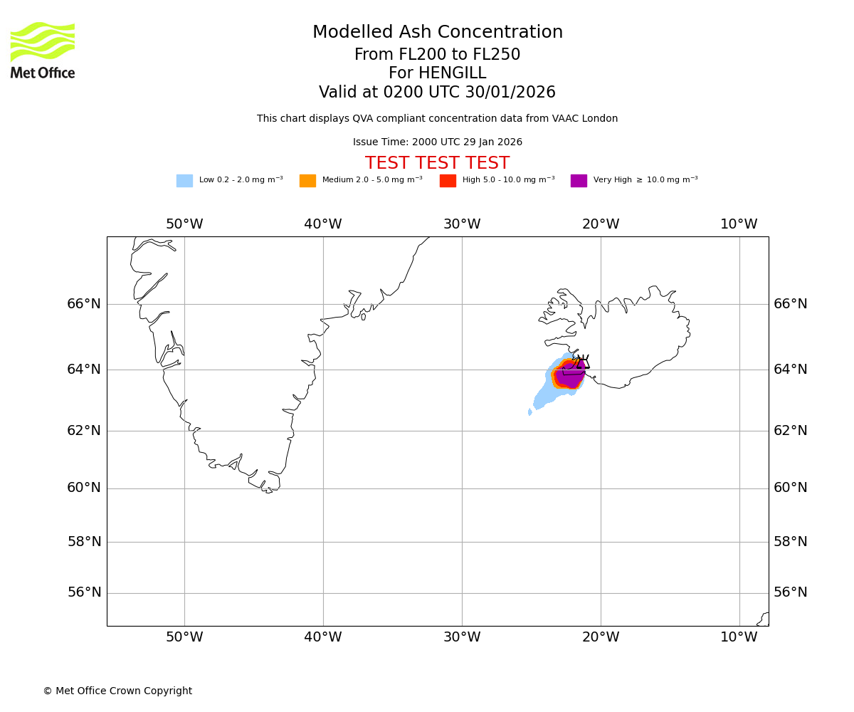 Modelled ash concentration from 000 to 200 for HENGILL. Valid at 2000 UTC 29/01/2026