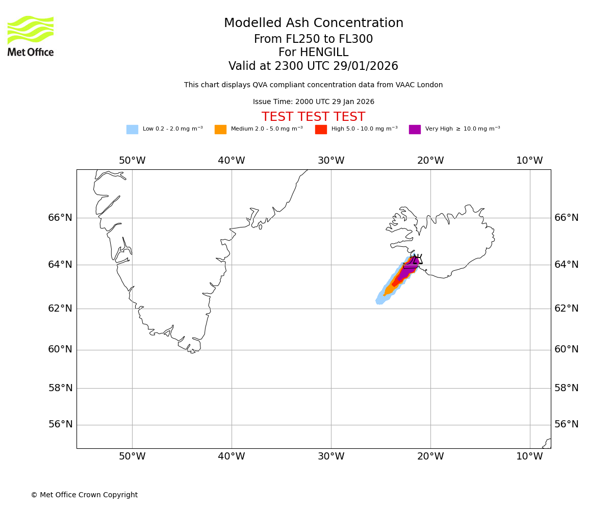 Modelled ash concentration from 200 to 250 for HENGILL. Valid at 2300 UTC 29/01/2026
