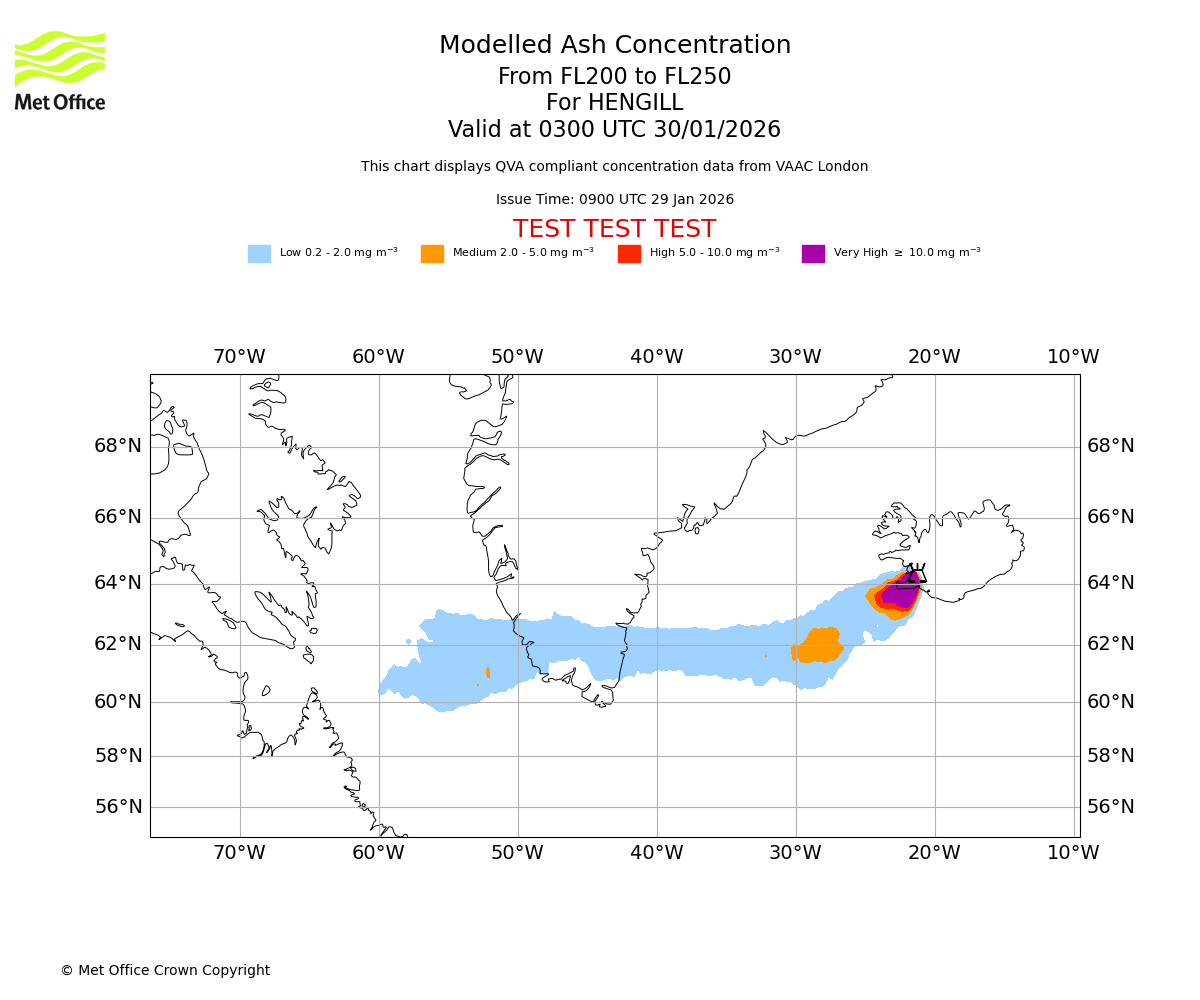 Modelled ash concentration from 200 to 250 for HENGILL. Valid at 0000 UTC 30/01/2026