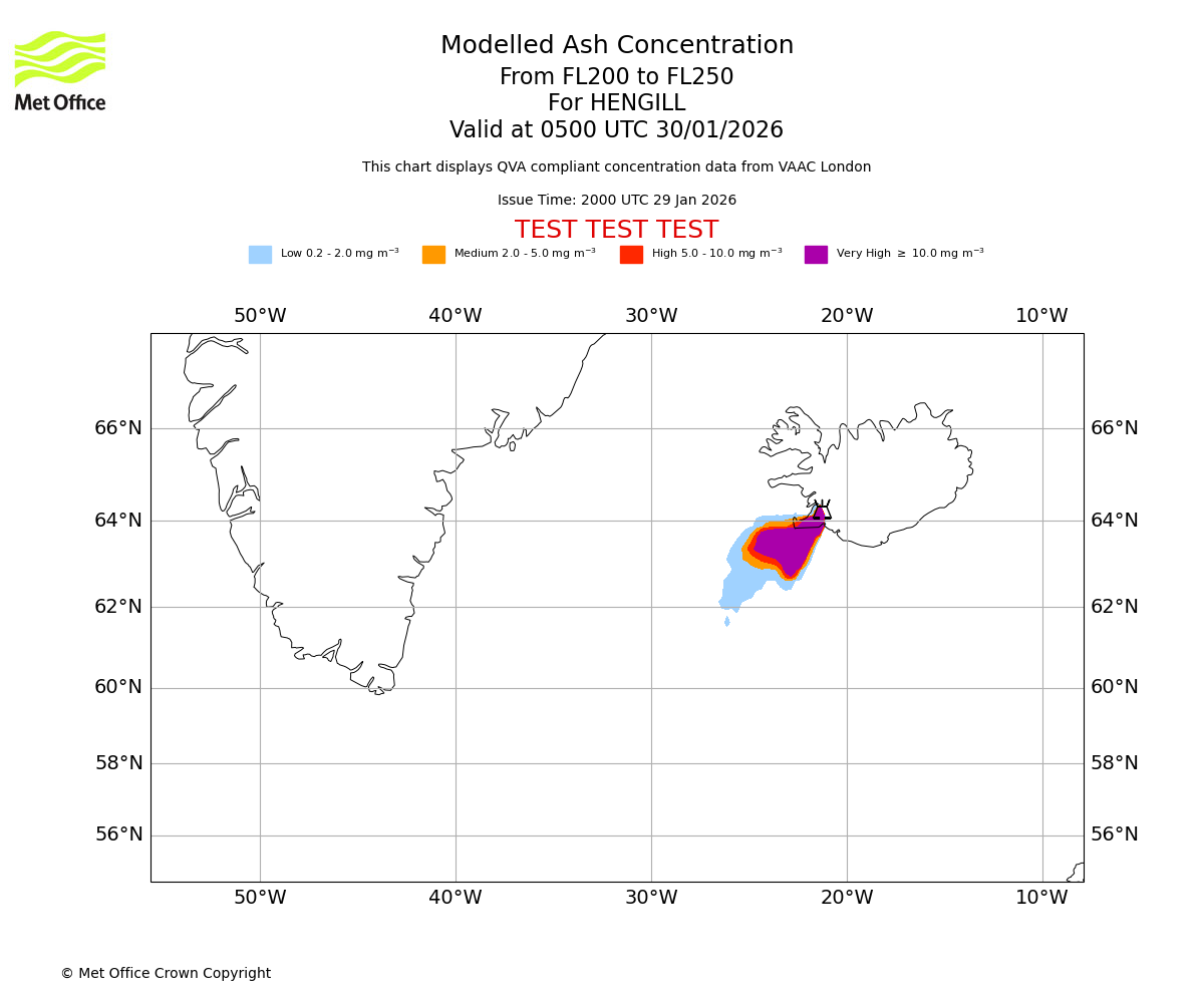 Modelled ash concentration from 200 to 250 for HENGILL. Valid at 0200 UTC 30/01/2026