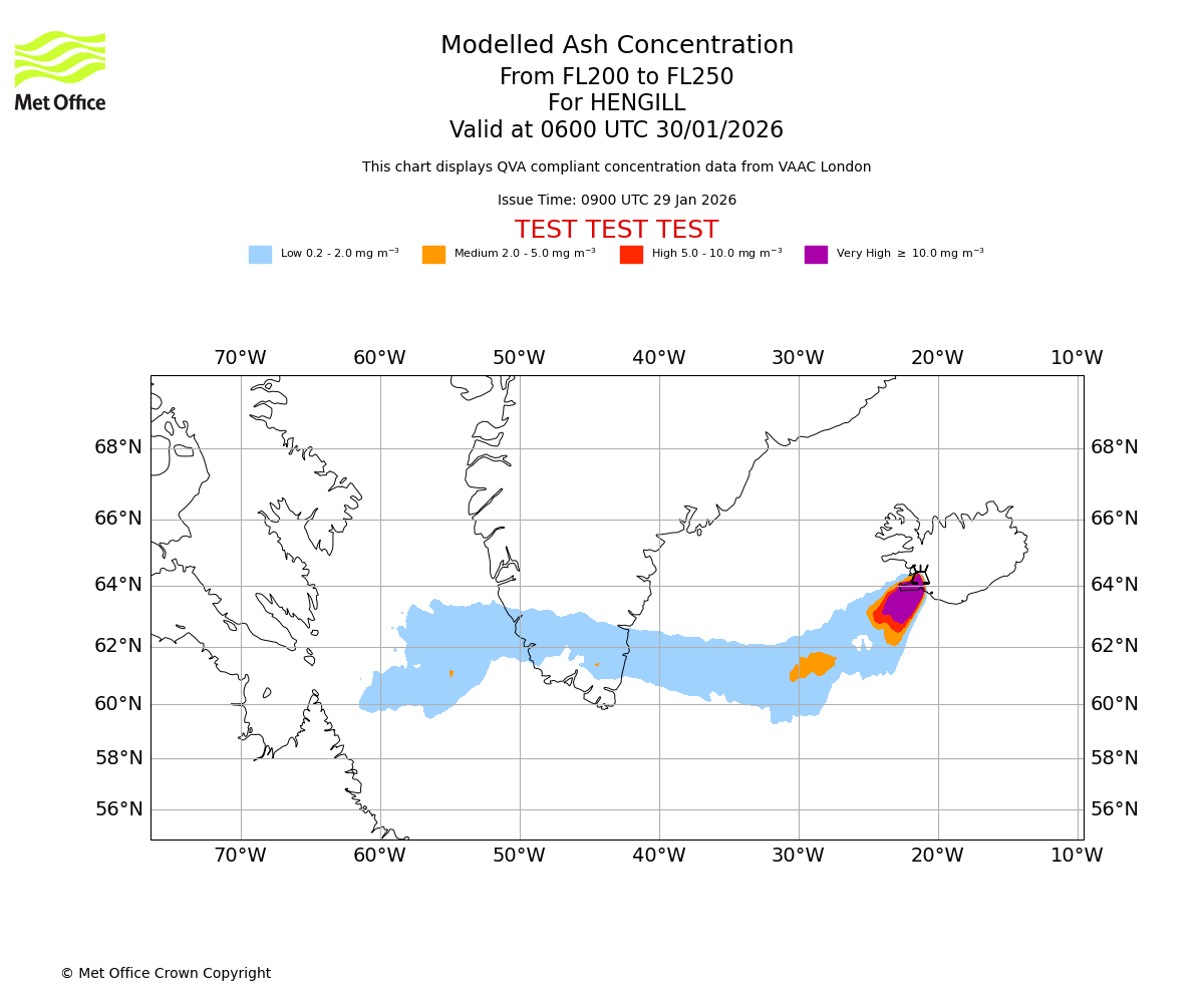 Modelled ash concentration from 000 to 200 for HENGILL. Valid at 0900 UTC 29/01/2026
