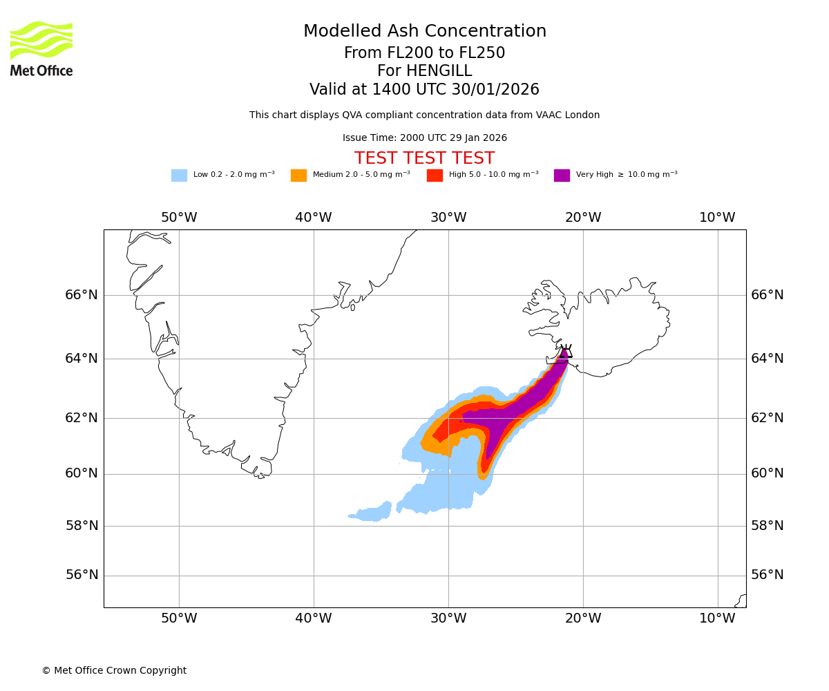 Modelled ash concentration from 200 to 250 for HENGILL. Valid at 1100 UTC 30/01/2026