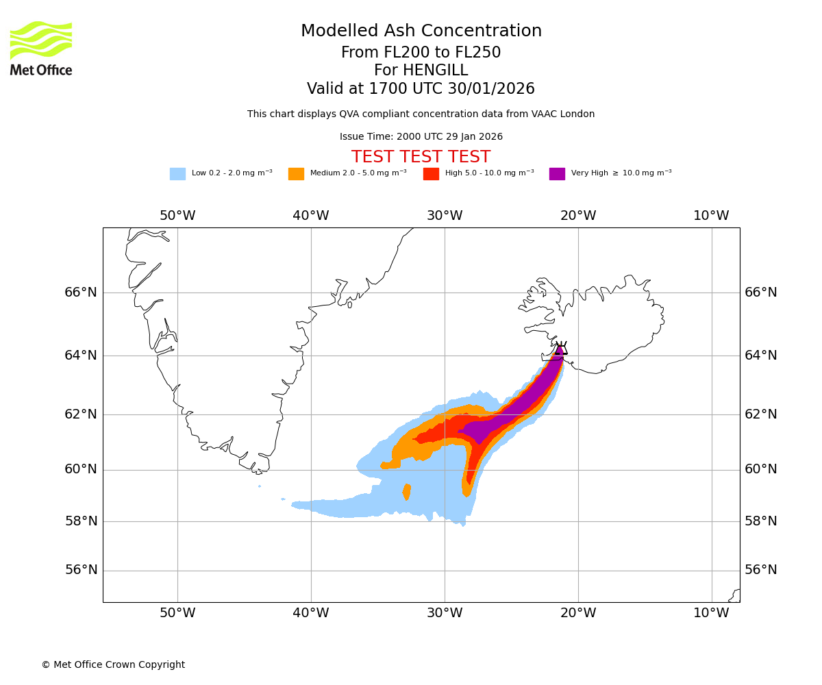 Modelled ash concentration from 200 to 250 for HENGILL. Valid at 1400 UTC 30/01/2026