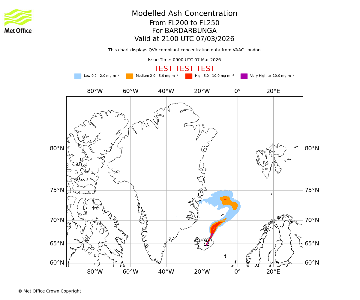 Modelled ash concentration from 000 to 200 for BARDARBUNGA. Valid at 0900 UTC 07/03/2026