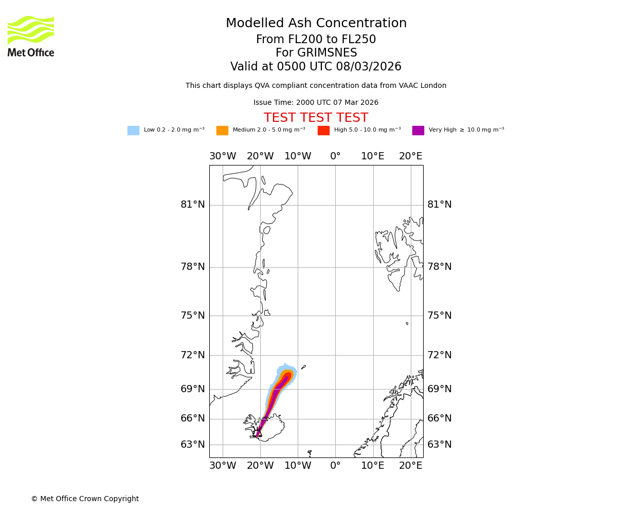 Modelled ash concentration from 000 to 200 for GRIMSNES. Valid at 2000 UTC 07/03/2026
