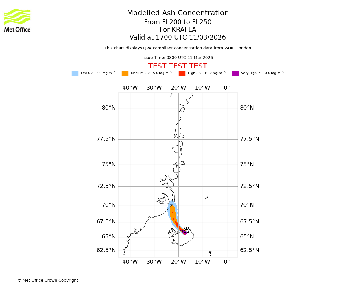 Modelled ash concentration from 200 to 250 for KRAFLA. Valid at 1400 UTC 11/03/2026