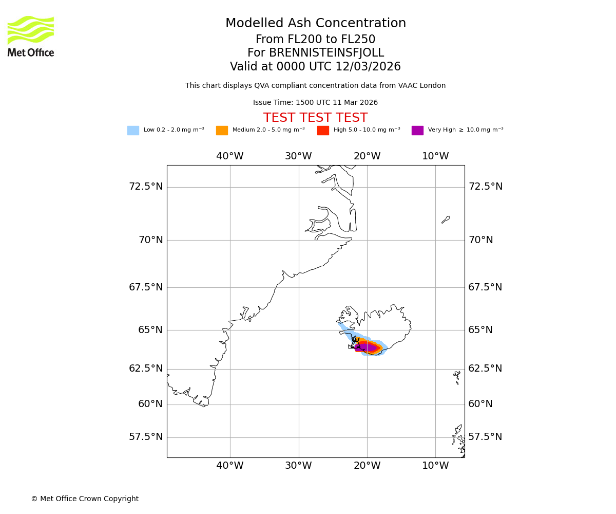 Modelled ash concentration from 200 to 250 for BRENNISTEINSFJOLL. Valid at 2100 UTC 11/03/2026