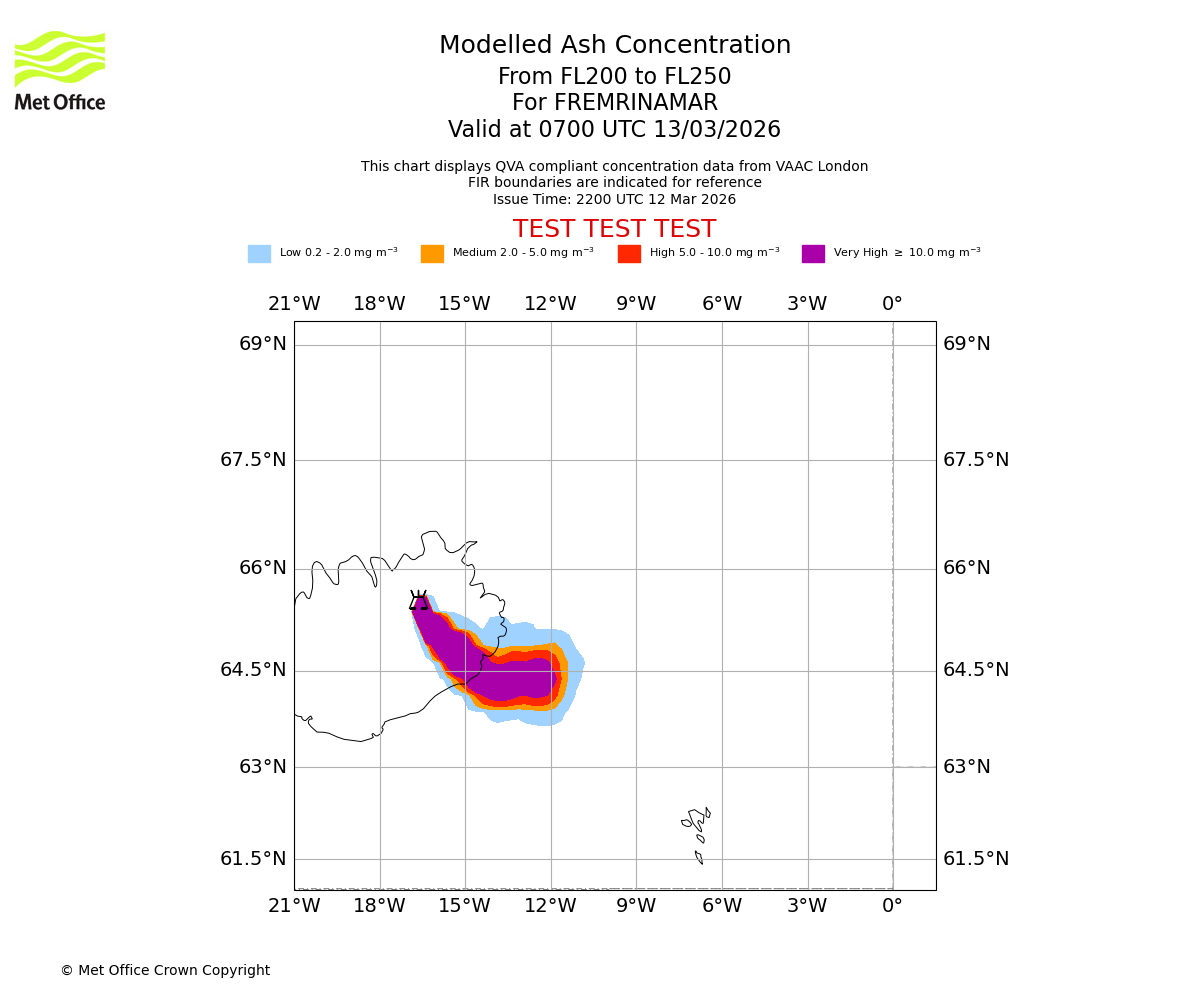 Modelled ash concentration from 000 to 200 for FREMRINAMAR. Valid at 2200 UTC 12/03/2026