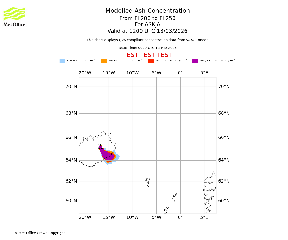 Modelled ash concentration from 200 to 250 for ASKJA. Valid at 0900 UTC 13/03/2026