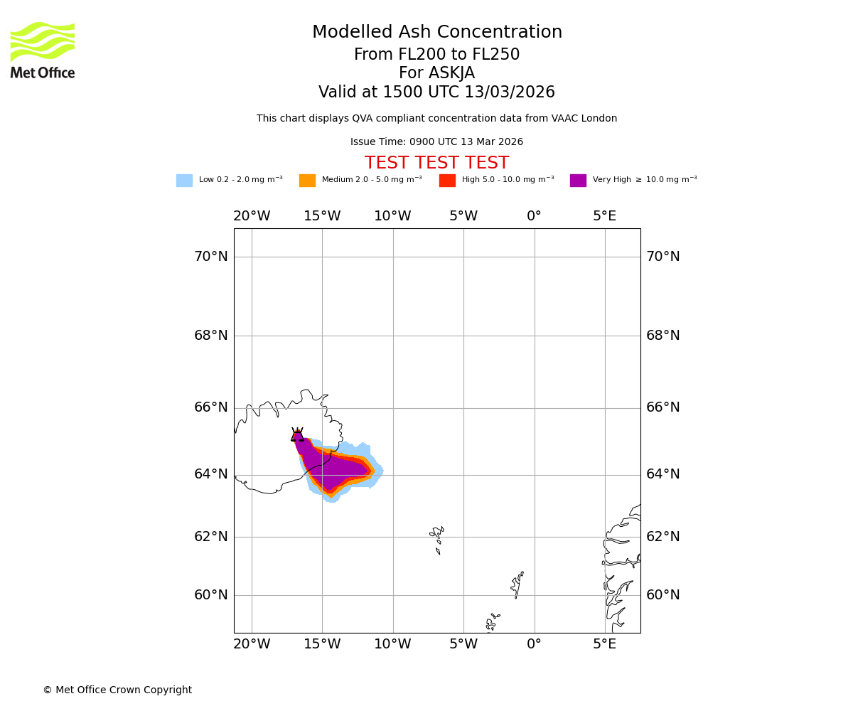 Modelled ash concentration from 000 to 200 for ASKJA. Valid at 0900 UTC 13/03/2026