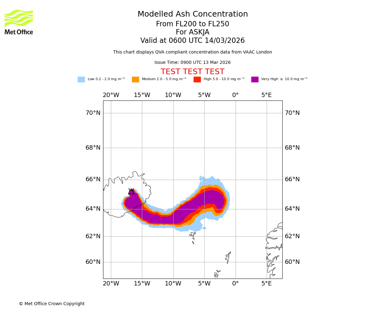 Modelled ash concentration from 200 to 250 for ASKJA. Valid at 0300 UTC 14/03/2026