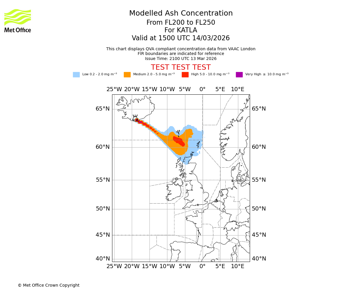 Modelled ash concentration from 200 to 250 for KATLA. Valid at 1200 UTC 14/03/2026