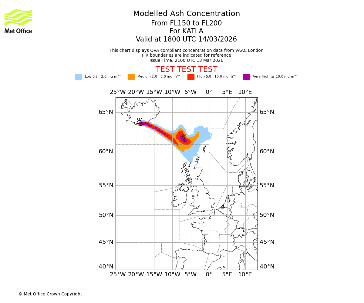 Modelled ash concentration from 200 to 250 for KATLA. Valid at 1800 UTC 14/03/2026