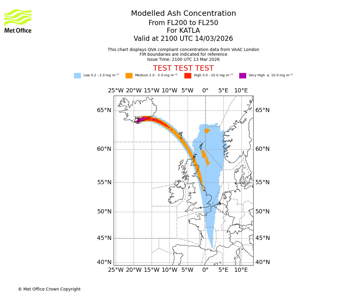 Modelled ash concentration from 000 to 200 for KATLA. Valid at 2100 UTC 13/03/2026