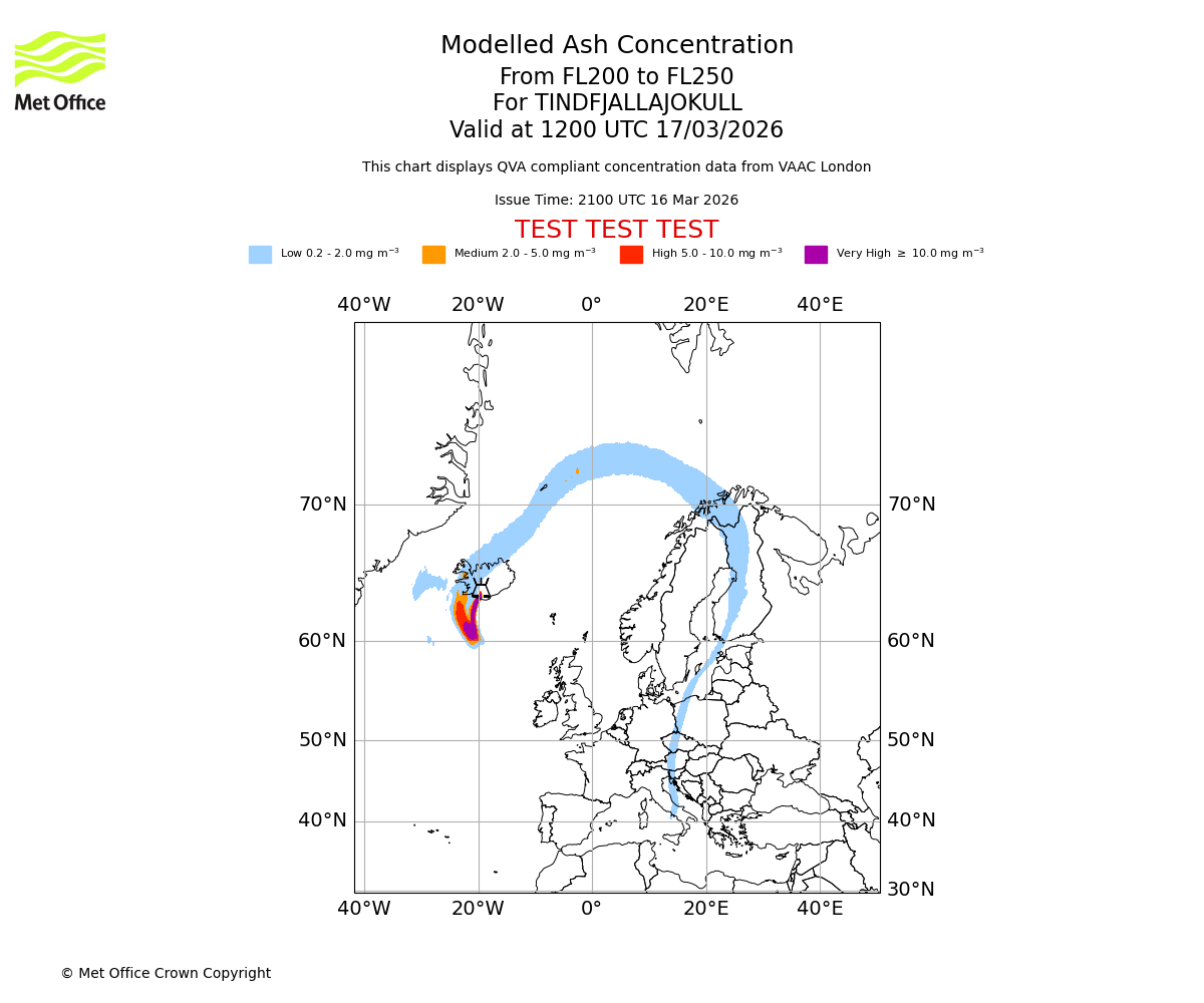 Modelled ash concentration from 000 to 200 for TINDFJALLAJOKULL. Valid at 2100 UTC 16/03/2026