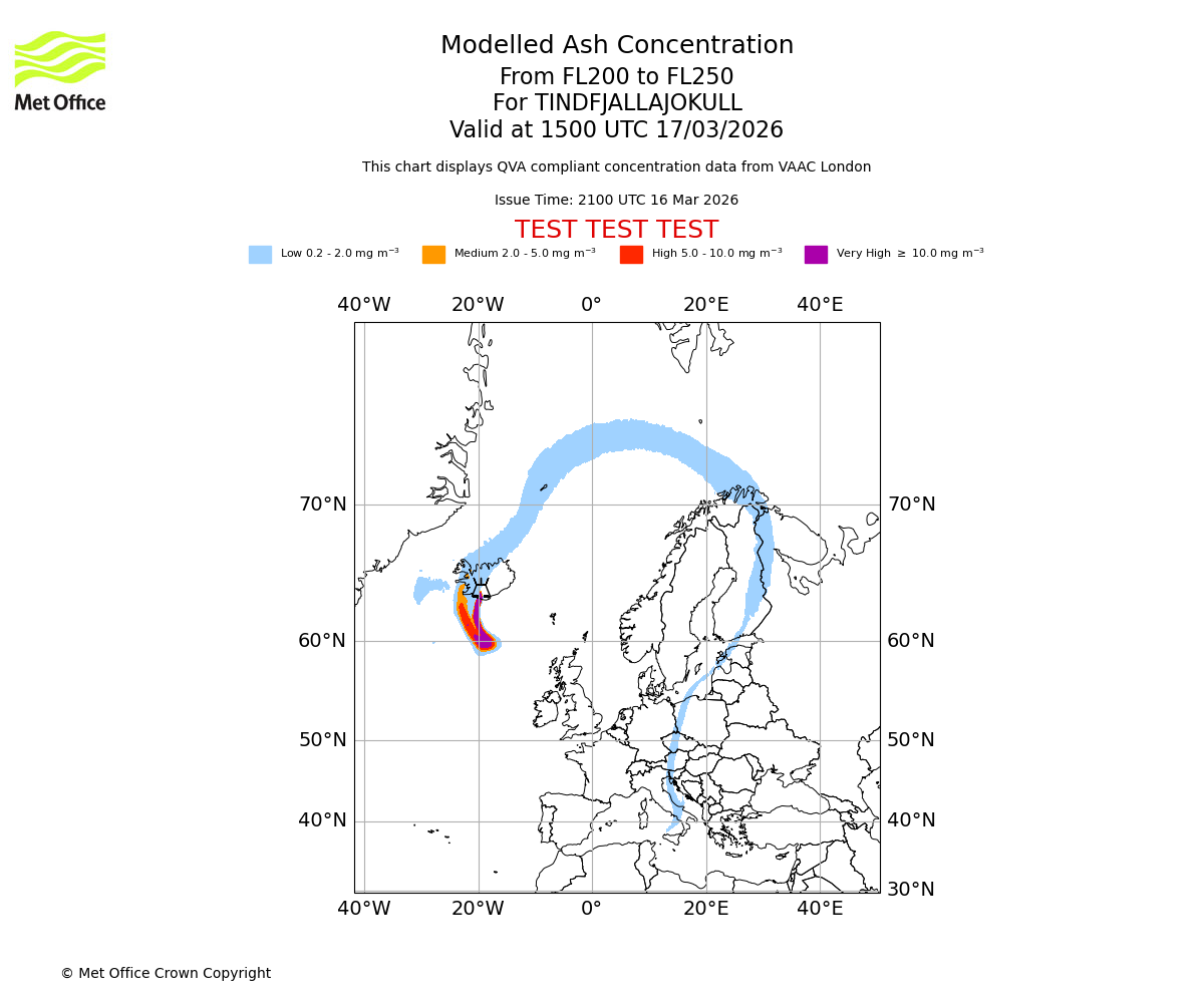 Modelled ash concentration from 000 to 200 for TINDFJALLAJOKULL. Valid at 2100 UTC 16/03/2026