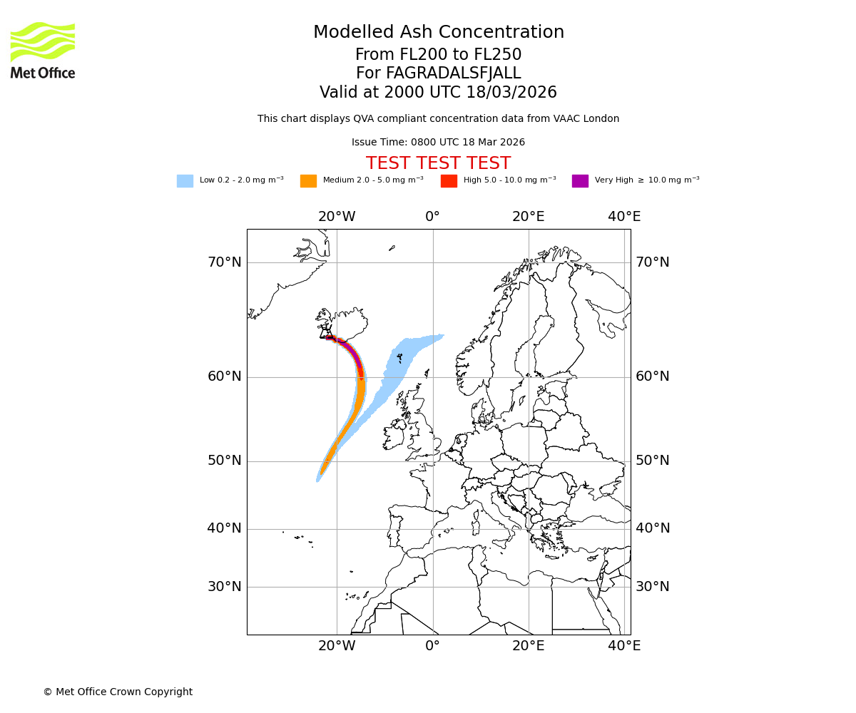 Modelled ash concentration from 200 to 250 for FAGRADALSFJALL. Valid at 1700 UTC 18/03/2026