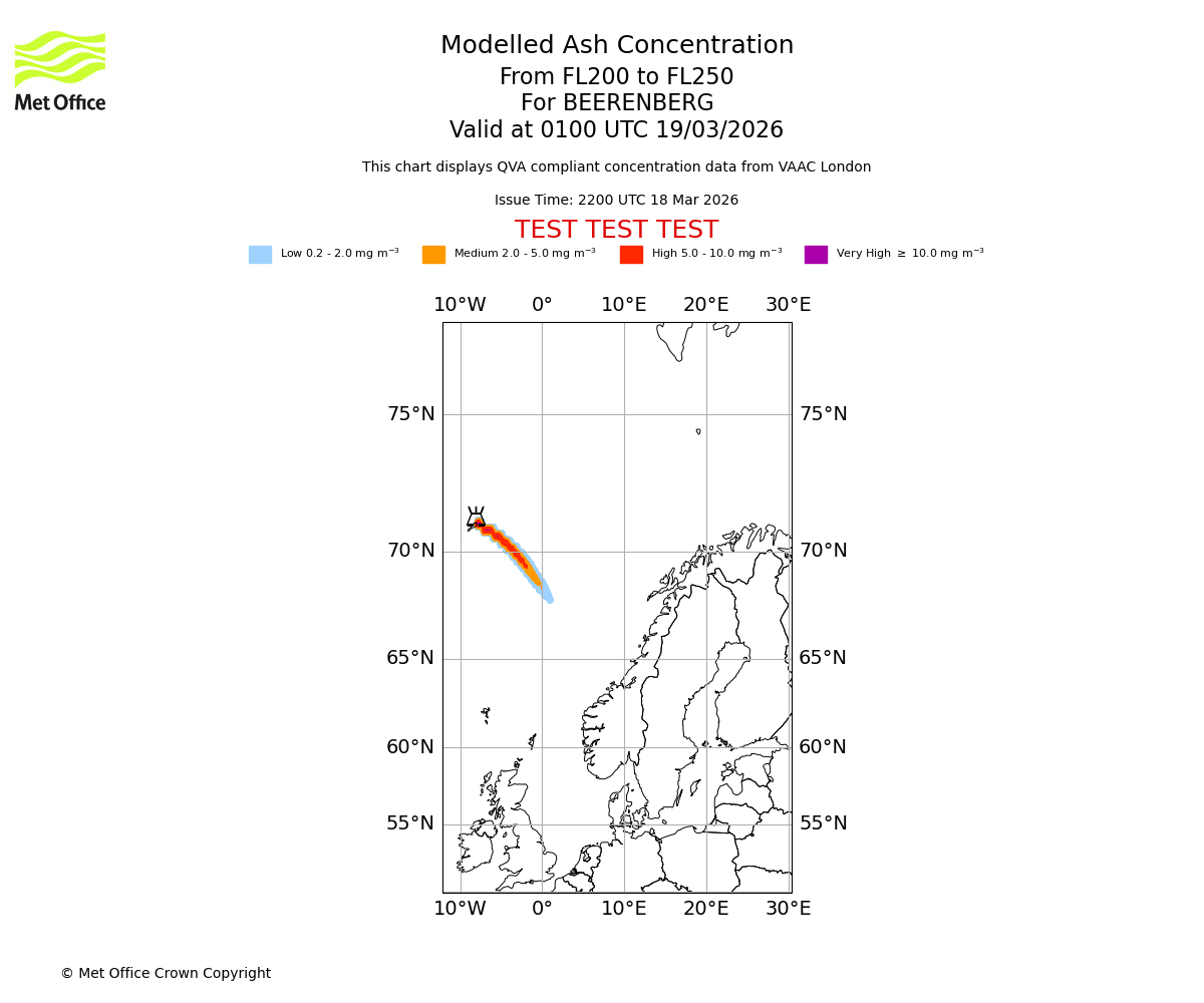 Modelled ash concentration from 200 to 250 for BEERENBERG. Valid at 2200 UTC 18/03/2026