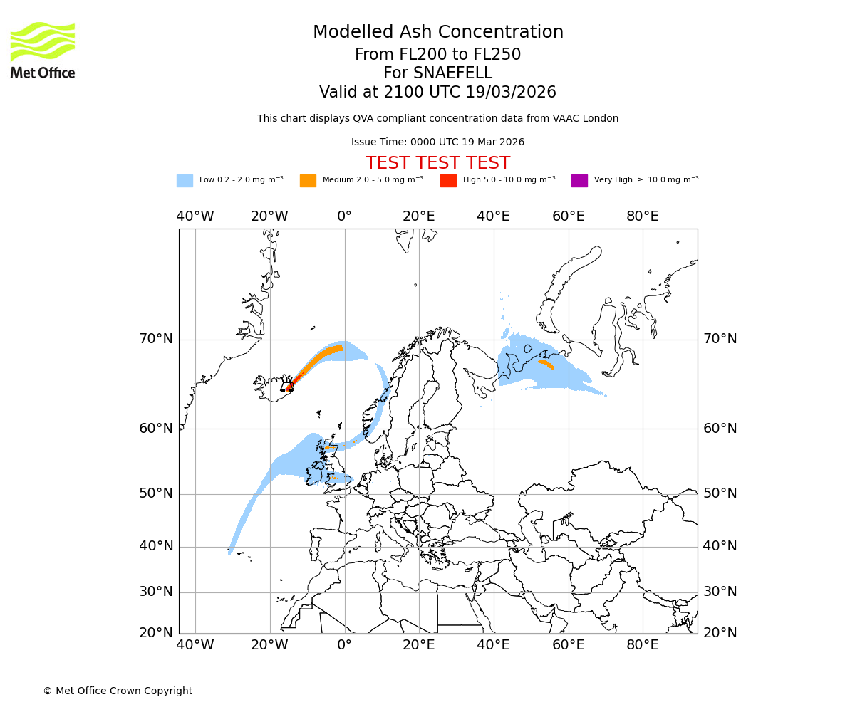Modelled ash concentration from 200 to 250 for SNAEFELL. Valid at 1800 UTC 19/03/2026