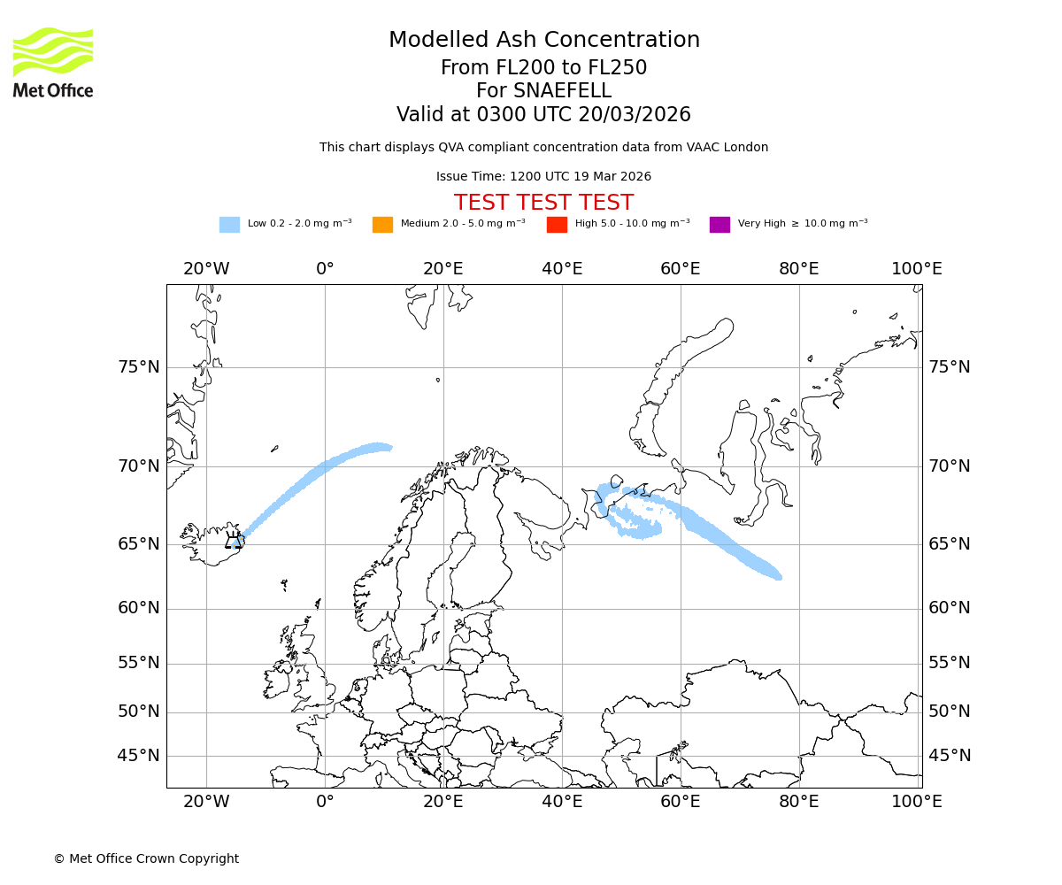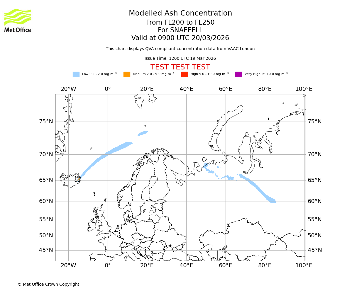 Modelled ash concentration from 200 to 250 for SNAEFELL. Valid at 0600 UTC 20/03/2026