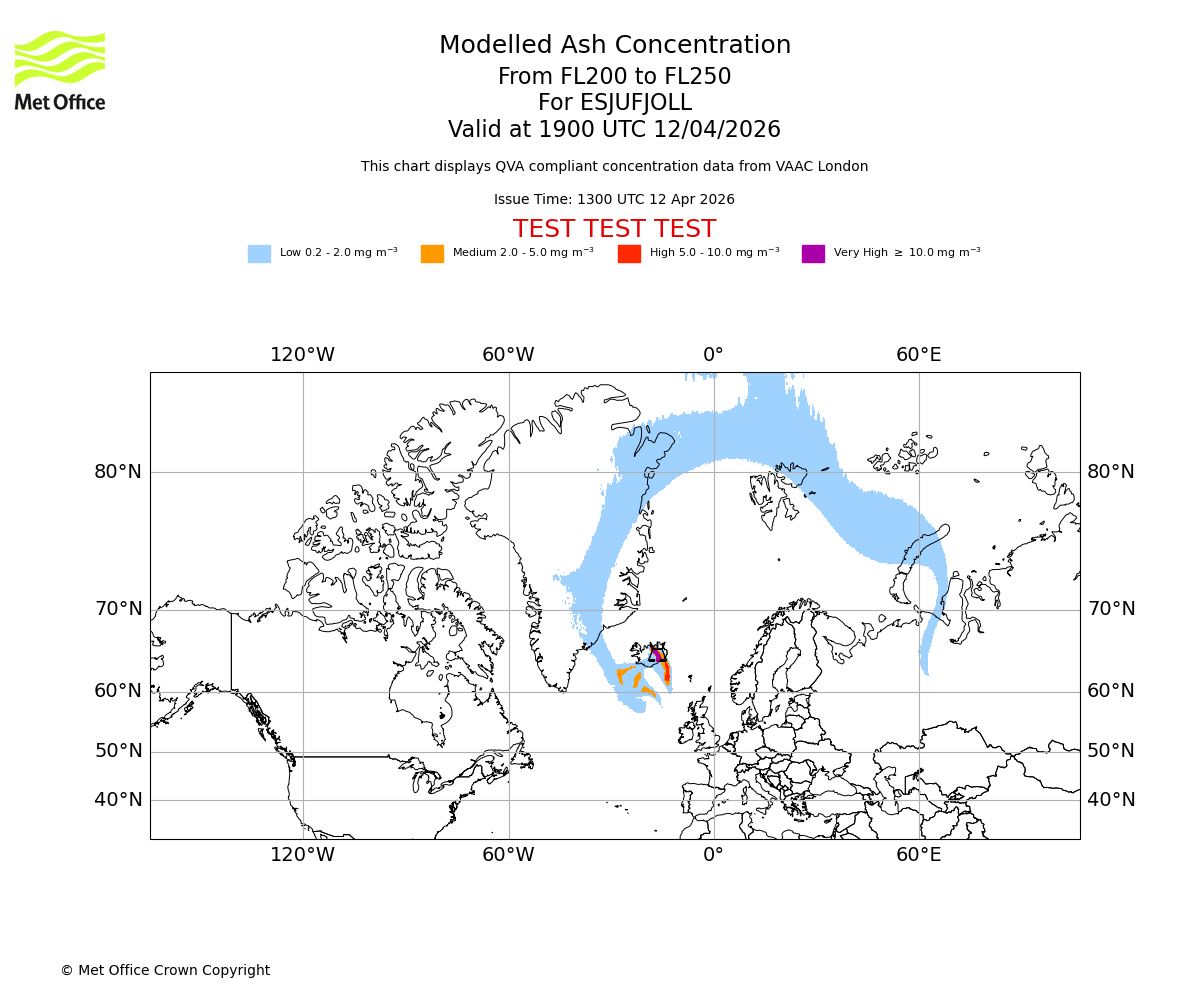 Modelled ash concentration from 200 to 250 for ESJUFJOLL. Valid at 1600 UTC 12/04/2026