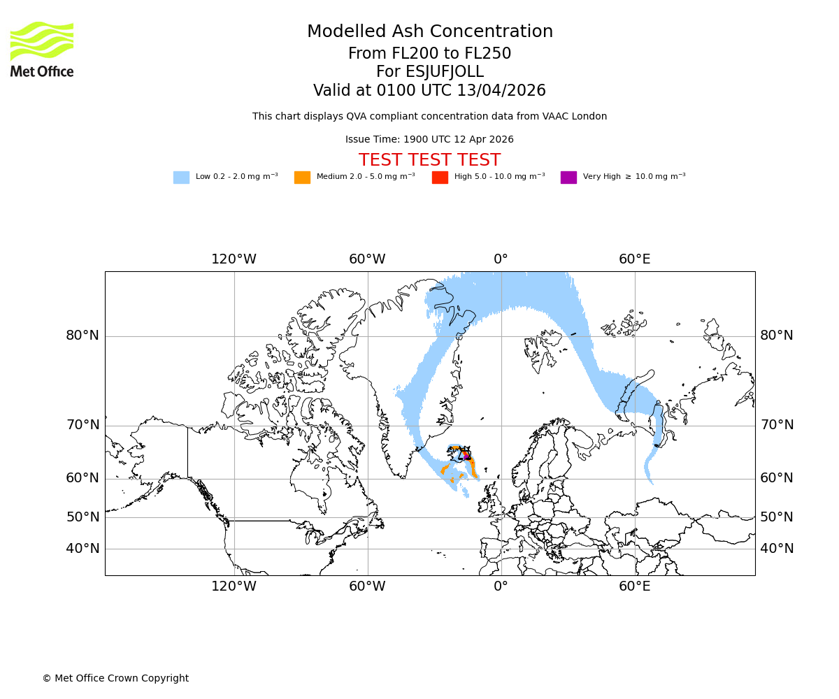 Modelled ash concentration from 200 to 250 for ESJUFJOLL. Valid at 2200 UTC 12/04/2026