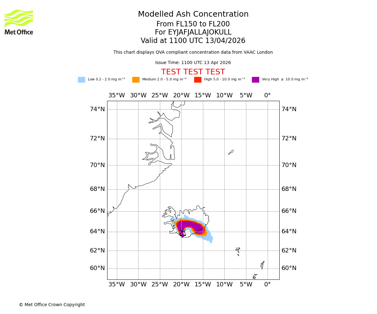 Modelled ash concentration from 000 to 200 for EYJAFJALLAJOKULL. Valid at 1100 UTC 13/04/2026