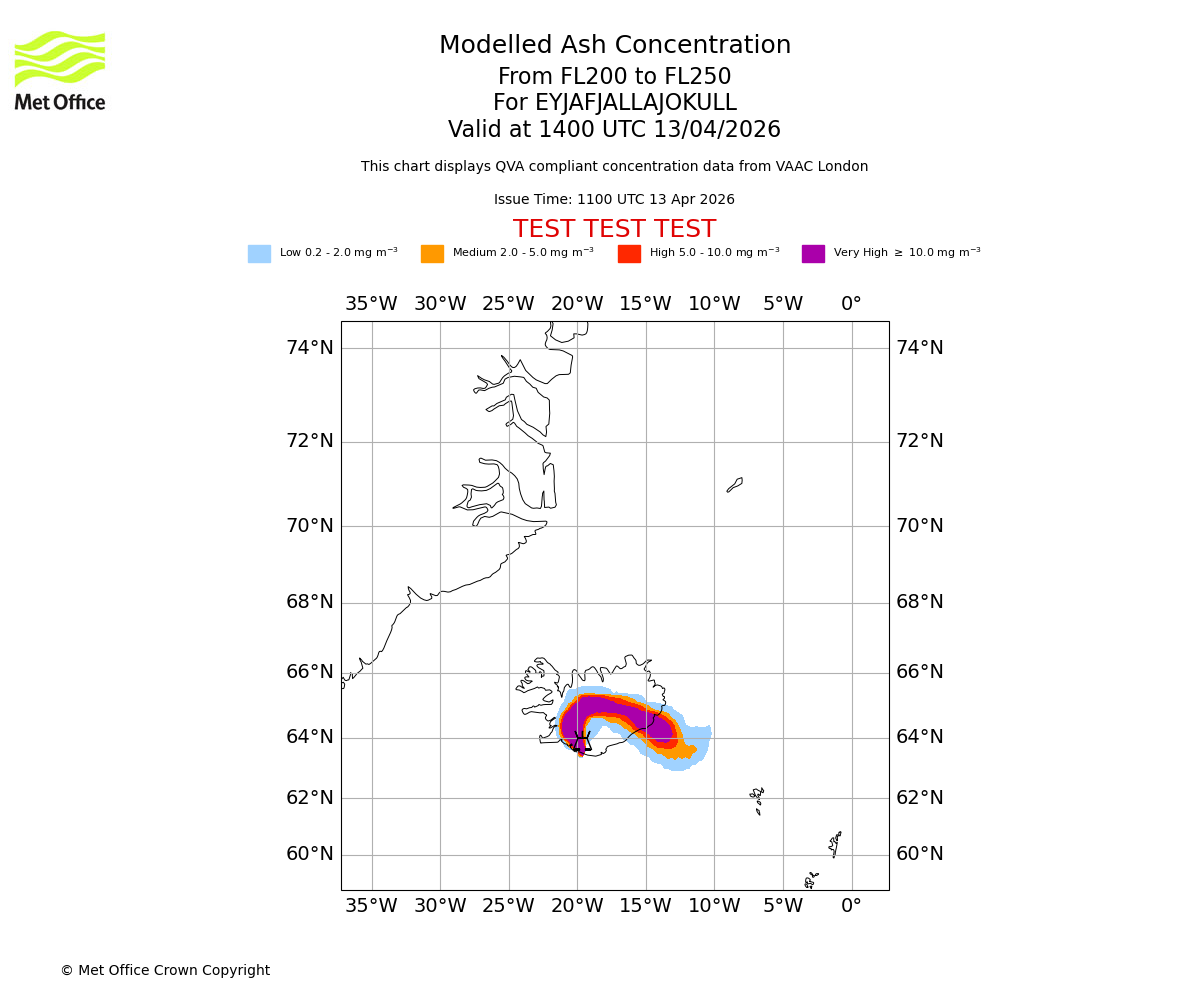 Modelled ash concentration from 200 to 250 for EYJAFJALLAJOKULL. Valid at 1100 UTC 13/04/2026