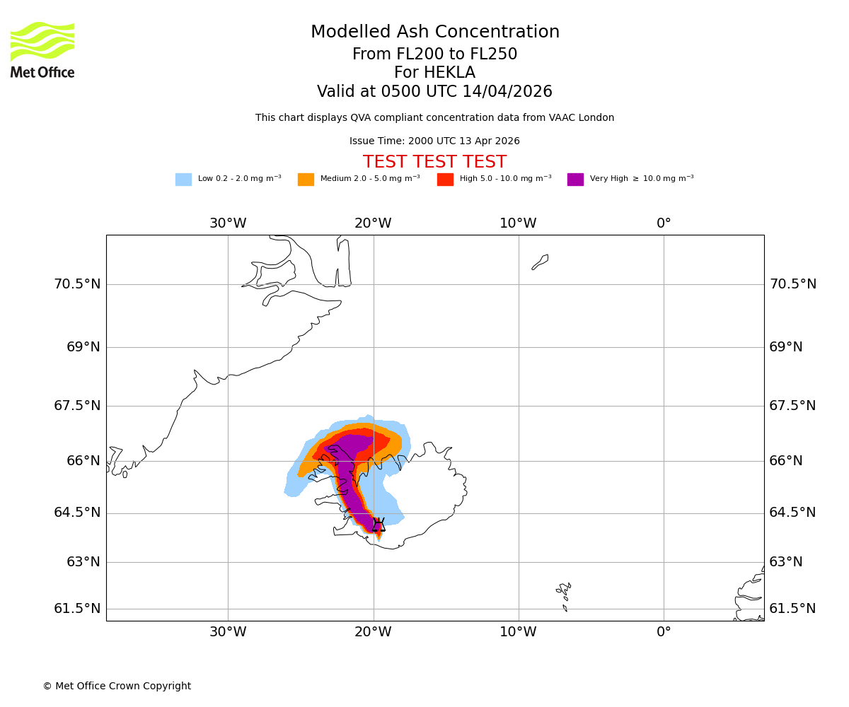 Modelled ash concentration from 200 to 250 for HEKLA. Valid at 0200 UTC 14/04/2026