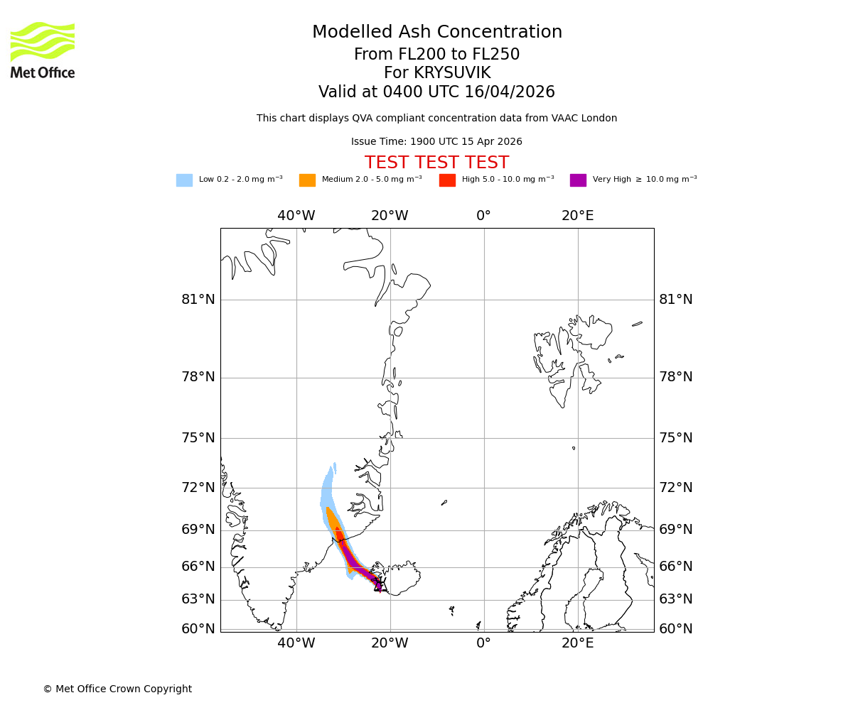 Modelled ash concentration from 200 to 250 for KRYSUVIK. Valid at 0100 UTC 16/04/2026